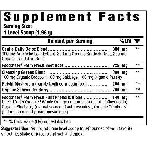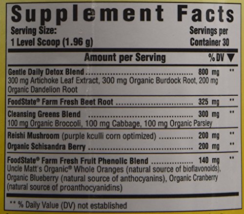 First to market, in delivering targeted whole food powder formulas to easily elevate the nutritional value and health benefit of any smoothie, shake, meal replacement, or juice/non-dairy beverage. Features cleansing foods, burdock root, dandelion root and artichoke with FoodState Farm Fresh Fruit Phenolic Blend and Reishi mushroom to support liver health and its to process and remove toxins from the body. Non-GMO ingredients third party verified by the Non-GMO Project.