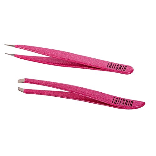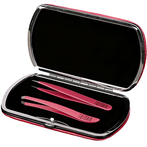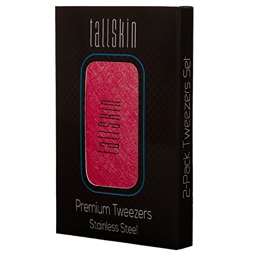 tallSkin 2-Pack Premium Stainless Steel Tweezers Set - Curved Designed Slanted Tip and Pointed Tip - with Sleek Magnetic Storage and Carrying Case (Pink Shimmer)