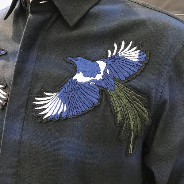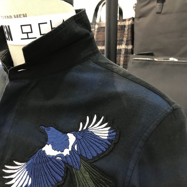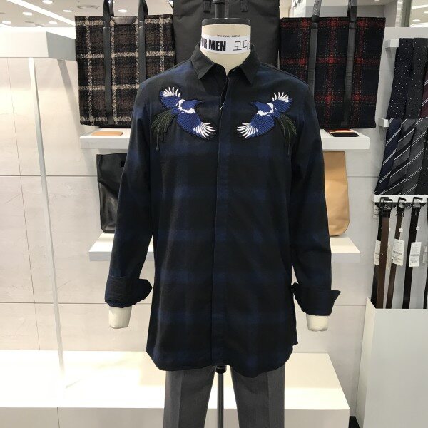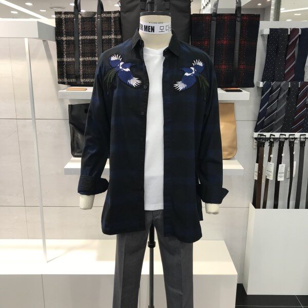 네이비 체크패턴 까치 자수 루즈핏 셔츠입니다.셔츠 하단 양쪽 옆트임과 루즈핏으로 아우터처럼 연출 가능한 아이템입니다 ^^앞쪽 가슴부분 까치 자수 디자인으로 단독 아우터처럼 포인트 연출이 가능하며, 아우터의 포인트 이너웨어로도 연출 가능합니다 ^^