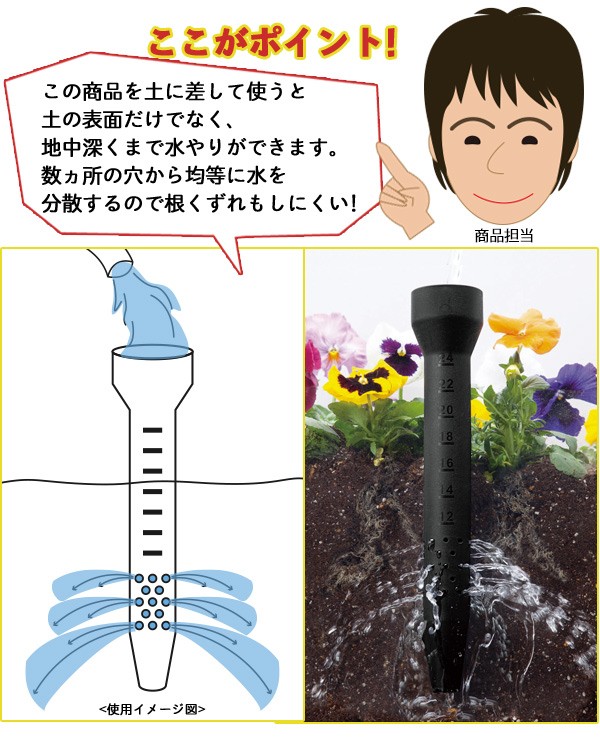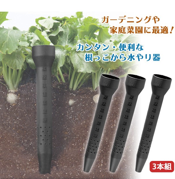 | <h1>差し込むだけ!土の中から水やりができる、まったく新しいタイプの給水器が登場!上から水を注ぐことで、土の表面だけでなく地中の根っこから水をあげることができます。数か所の穴から均等に水を分散するので根くずれもしにくい!ガーデニングや家庭菜園に最適です。土に何cm差し込んだか確認できるメモリ付き。3本組/水やり/水分補給/給水器/園芸用品/ガーデニンググッズ/花壇/造園/家庭菜園/栽培</h1> |