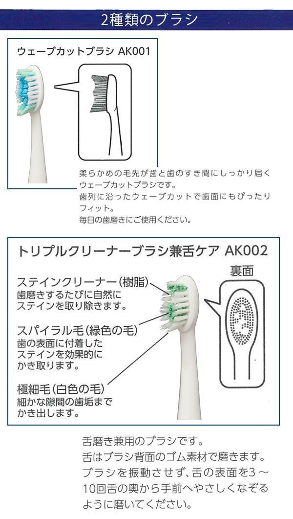| セット内容 | 本体(バッテリー内蔵)、替えブラシ(ウェーブカットブラシ・トリプルクリーナーブラシ)×各1本、充電器台、USB電源アダプタ、充電トラベルケース、USBケーブル、取扱説明書兼保証書(保証期間:1年) |