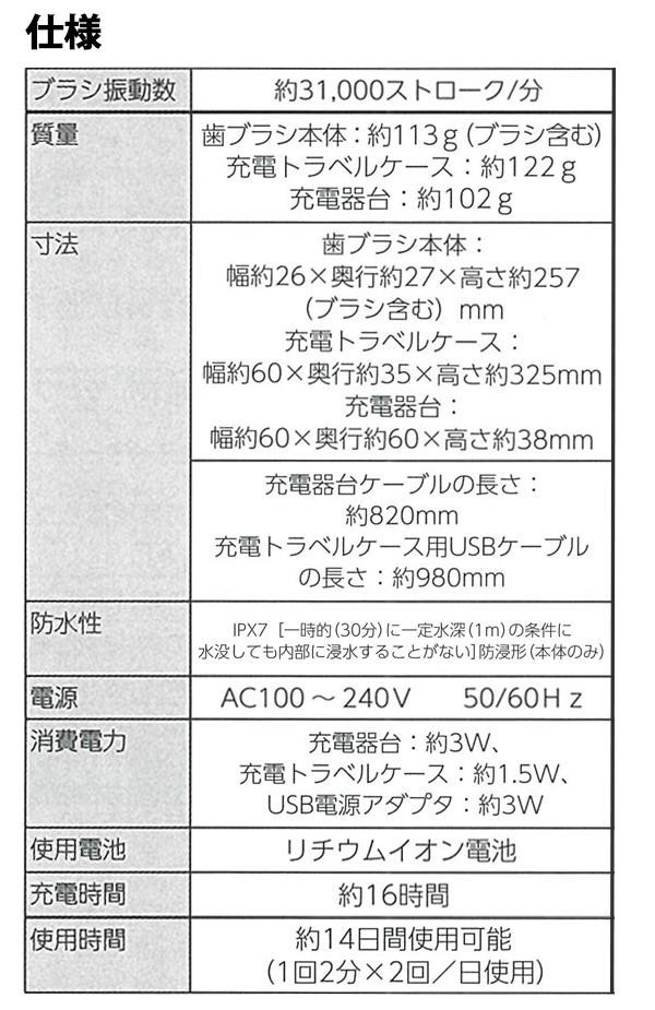 | 素材・材質 | 本体:ABS樹脂、柄:PP樹脂、毛:ナイロン 充電器台:PC樹脂・ABS樹脂 |