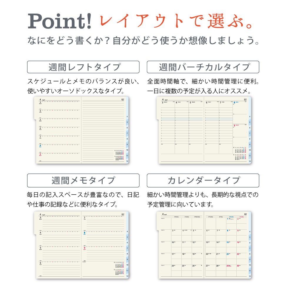 It is easy to carry around, yet the space to write is batchy, it is very easy to use. I also like the schedule for one month with a spread. It is nice as it is, but since many people use it around me, I use my favorite picture on the cover and a transparent cover so that it can be distinguished.