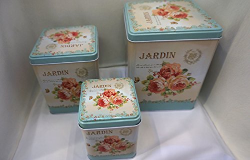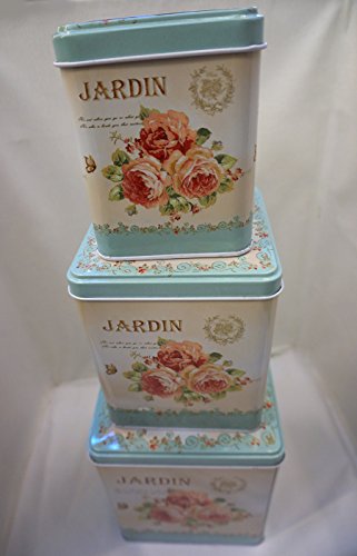 Beautiful Cookie Storage Tins, Shabby Chic, Square Shaped Jardin themed with floral rose design Set of 3