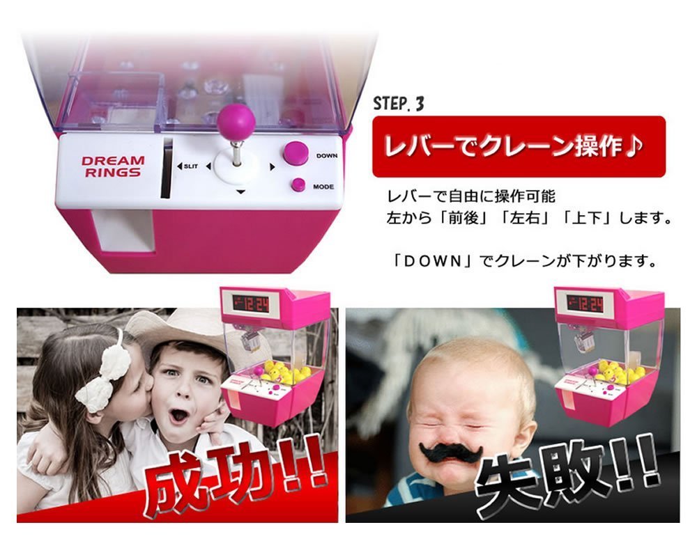 Passing a coin through a slit starts the game, and although it is small, you can move the crane vertically and horizontally to play the game. I have a ball for the prize, but it looks fun to put candy balls or lotters instead. Since it sounds a little big, I myself hid the speaker part with the masking tape (although the operation sound called a gagaga when the crane returns, it will not be possible in any way ^ ^;). I think that shiny light is fun as an interior. I think that it is a good product if you think about the price.