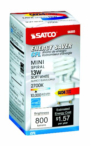 Satco S8203 13 Watt (60 Watt) 800 Lumens Mini Spiral CFL Soft White 2700K GU24 Base Light Bulb