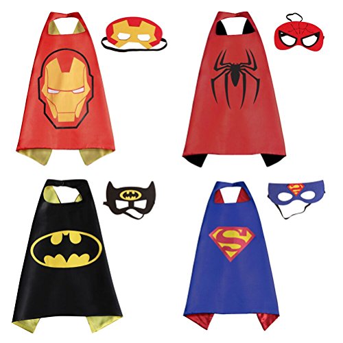 -. Brand : Gold Hands -. Color : multi -. Department : unisex-child -. Feature : 4 Sets Superhero capes with masks: Superman + Spiderman + Ironman + Batman. / Size: about 70*70 CM (27.5*27.5 In). Suit for all children. / Satin Capes - Durable Double Sided Capes, Easy to Velcro Neck! / Felt Masks - Comfortable for children wear it to pretend! / Great for Halloween, Superhero , Birthday, Dress-up Party Costumes and More -. Label : Tuo Jing -. Manufacturer : Tuo Jing -. PackageQuantity : 4 -. ProductGroup : Apparel -. ProductTypeName : CHILDRENS_COSTUME -. Publisher : Tuo Jing -. Size : 70*70 CM -. Studio : Tuo Jing -. Title : Superhero Capes and Masks Great For Children Pretend Costumes Cosplay -. UPC : 603149335998