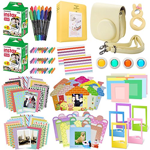 135 PIECE ACCESSORY KIT CONTAINS: 40 sheets of Fujifilm INSTAX Mini Instant Film, 1 Case, 1 Album, 4 Close up filters, 12 Marker pens, 10 Paper frames, 10 Bunny paper frames, 9 House Frames, 5 color plastic frames, 1 Selfie mirror lens, 2 sheets of corner stickers, & 40 piece film stickers