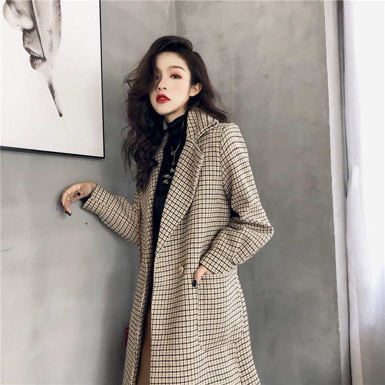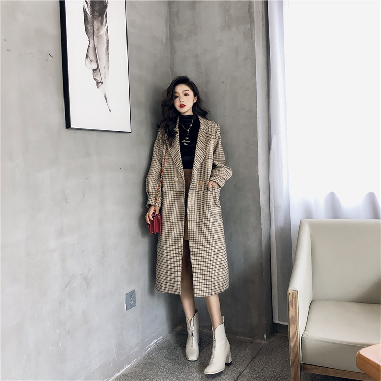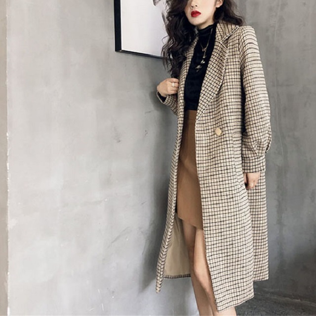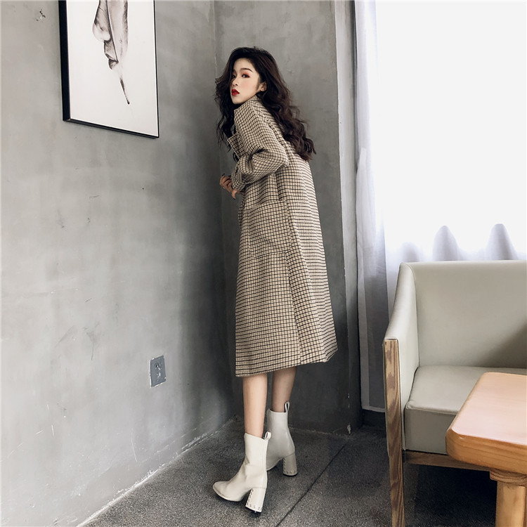 定番人気のチェック柄、スーツのようなきっちり感のあるデザインの膝下丈コートです。