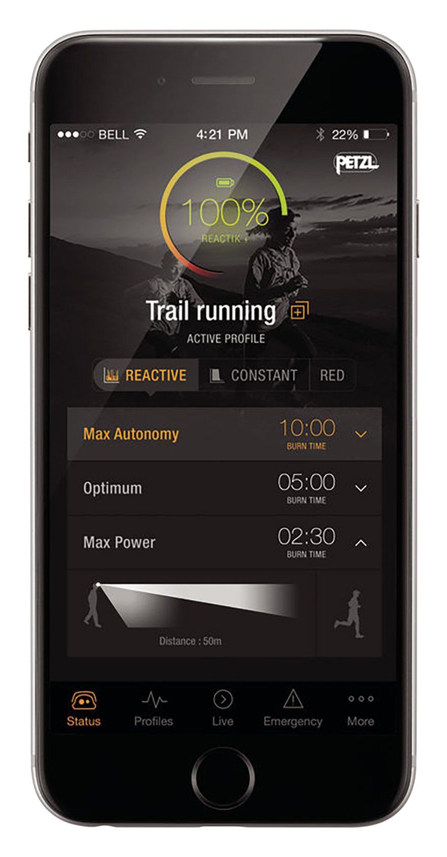 · Application for smartphone and tablet terminal MyPetzl Light allows customization of beam pattern, irradiation time and brightness (free download on the Apple Store, Google Play).