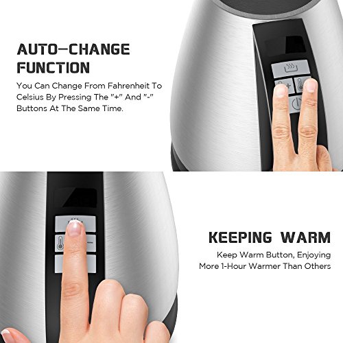 GENAUE DIGITALE BEDIENUNG: Sie konnen Wasser bis auf das Grad genau erhitzen. Nie wieder verbrannter Kaffee! Schon mit der Power-Taste konnen Sie die Standardtemperatur von 100°C aktiveren. Nutzen Sie die + und - Tasten, um die gewunschte Temperatur einzustellen. Sobald das Wasser kocht und die gewunschte Temperatur erreicht wurde, ertont ein Ton.