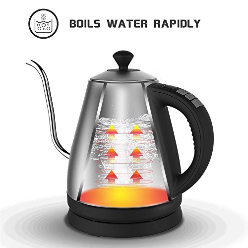 KOCHT SCHNELL WASSER: Die Kanne verfugt uber das Strix Thermomat. Diese 120V, 1000W Kanne benotigt nur 3 Minuten, um 1 Liter Wasser zum Kochen zu bringen. Die Warmhaltefunktion ermoglicht, dass Ihr Wasser fur 1 Stunde heiss gehalten wird, sodass Sie das Wasser nicht neu erhitzen mussen. Diese Kann schaltet sich auch automatisch aus, wenn der Kochpunkt erreicht wurde. Die LED Leuchte zeigt Ihnen an, ob die Kanne eingeschaltet ist.