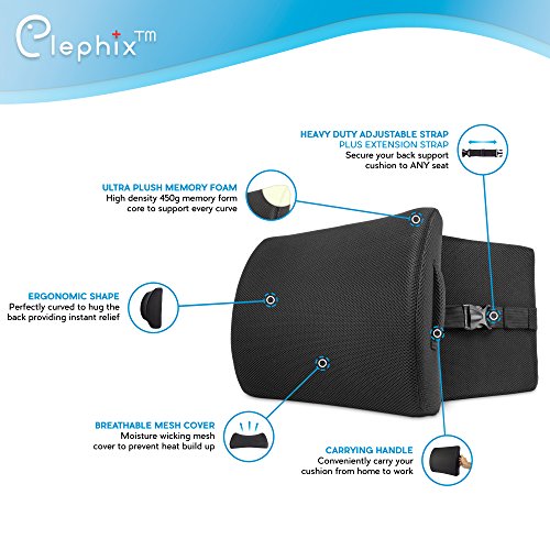 -. Brand : Elephix -. Color : Black -. EAN : 0799207216320 -. Feature : ULTRA PLUSH: High density 450g memory foam core provides unrivaled support and comfort. / BUILT TO LAST: From Top to Bottom, Inside and Out we have focused on making a Quality Product. / WORKS ANYWHERE: Designed to work in seats and chairs of ALL sizes. / PORTABLE: Comes with Free Carry Case Making it easy to Tote or Pack! / DISCOUNTED: Always check our Special Offers and Product Promotions for new DEALS! -. MPN : B01LXLLV4R -. PartNumber : B01LXLLV4R -. ProductGroup : Home -. ProductTypeName : HOME_BED_AND_BATH -. Size : Large -. Title : NEW 2017 Lumbar Cushion - Ultra Plush Thick Soft Back Support Orthopedic Lower Back Pillow -. UPC : 799207216320