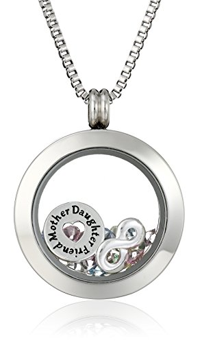 Stainless steel box chain necklace featuring transparent open-and-close round pendant filled with "Mother Daughter Friend" charm