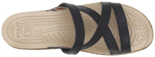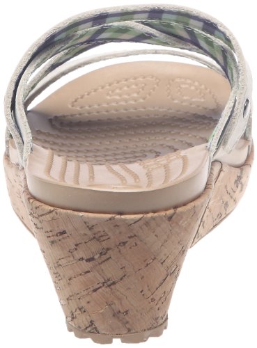 -. Feature : Slide sandal with crisscross straps featuring perforated footbed and faux-cork wedge
