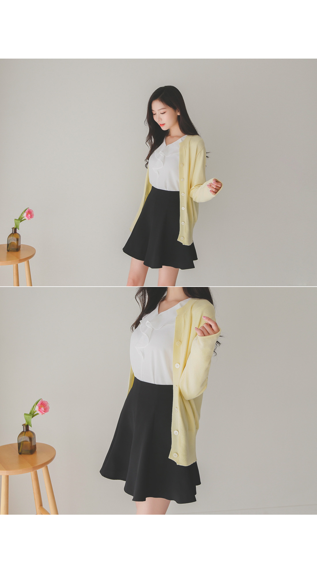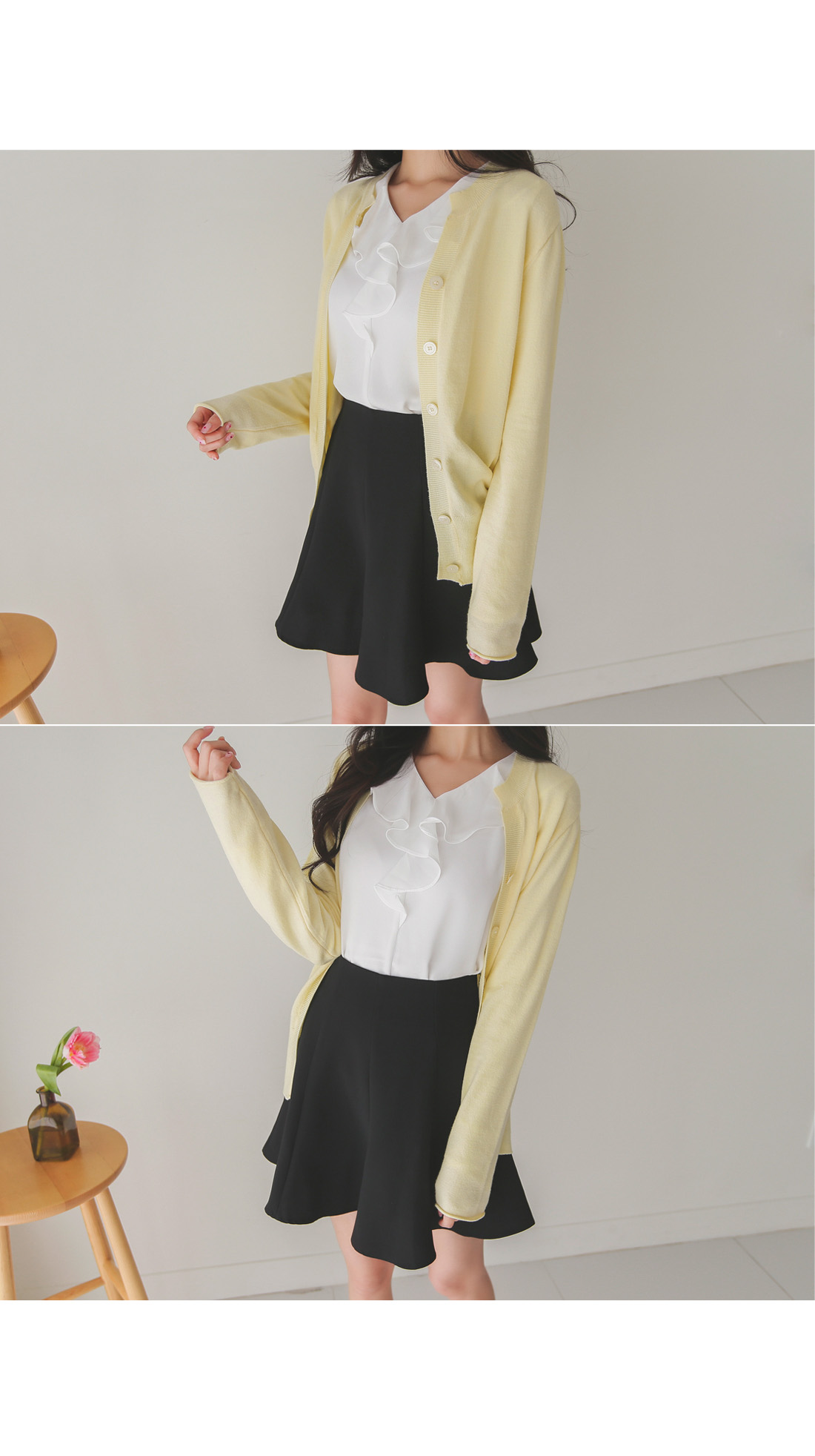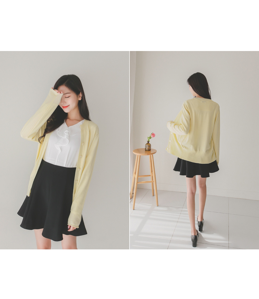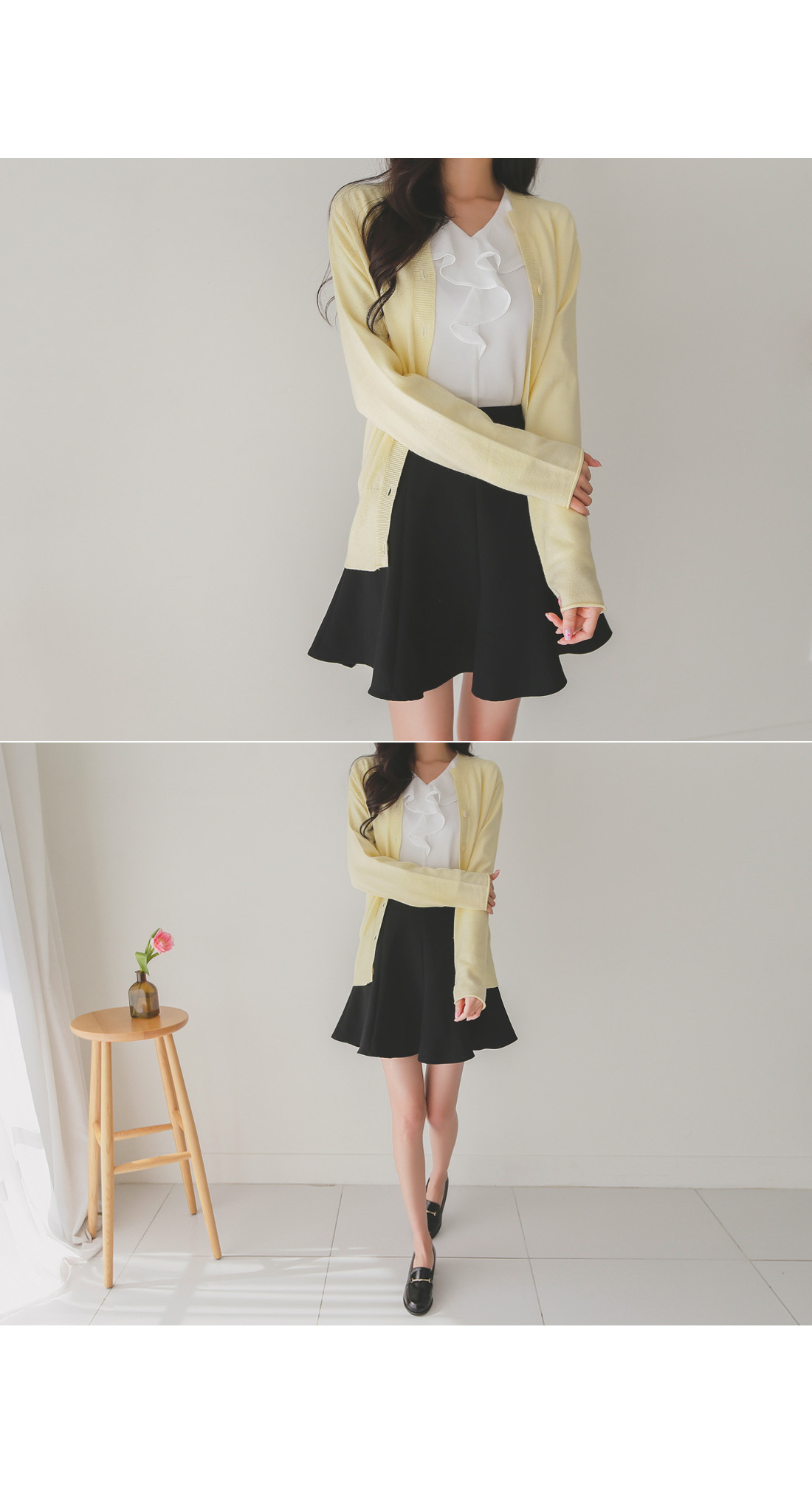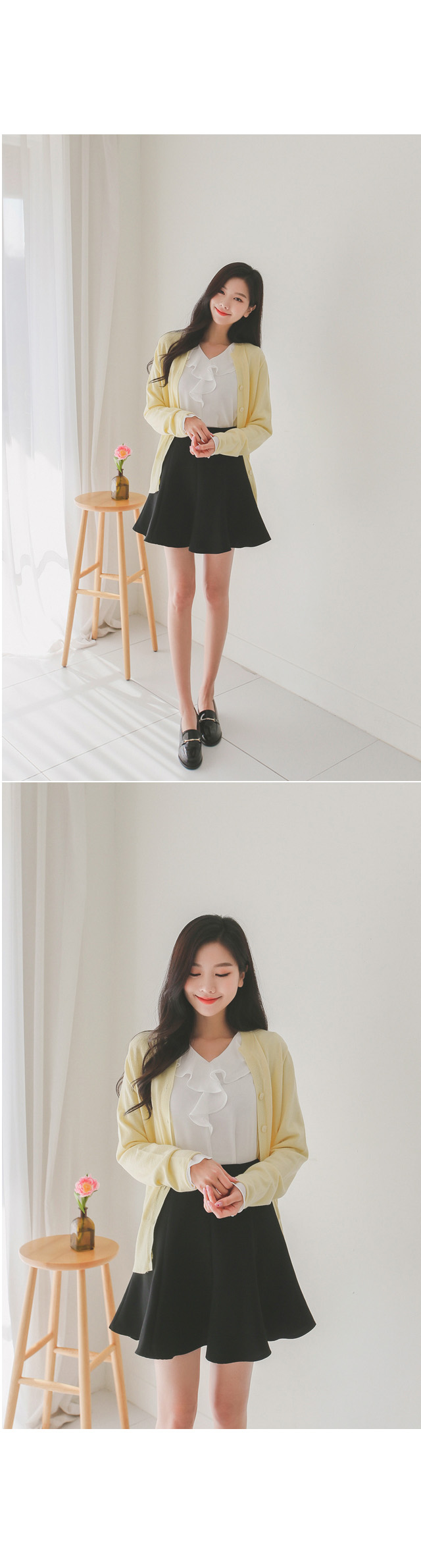 버튼을 모두 클로징해서 니트탑처럼 연출해도 좋아요!