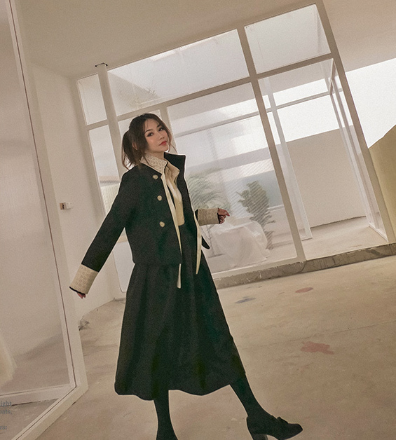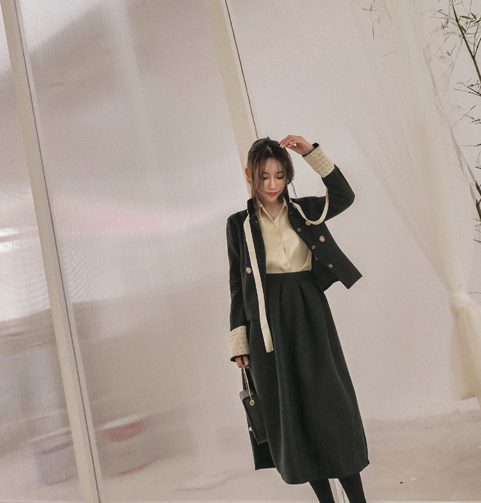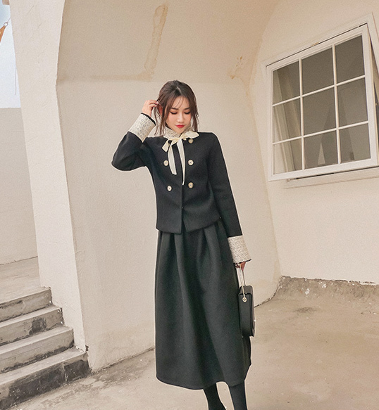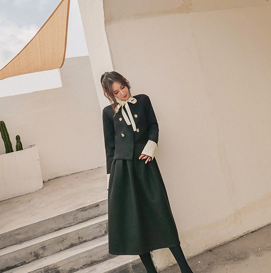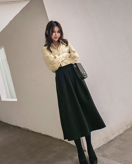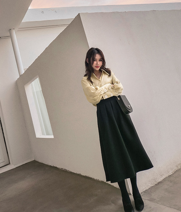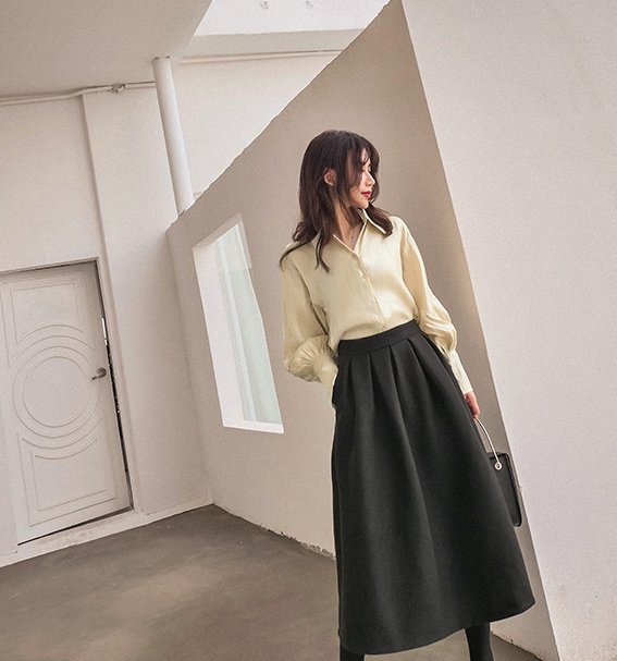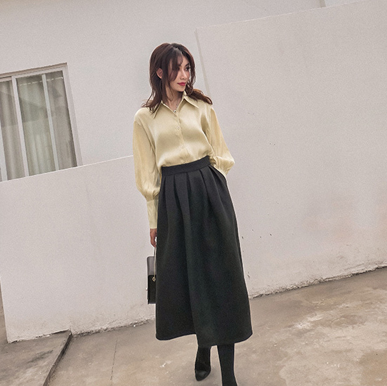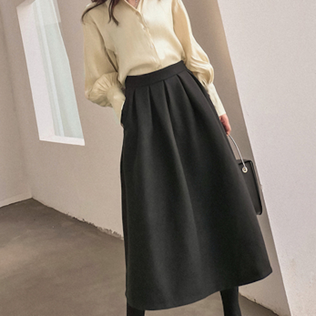 モノトーンカラーで大人っぽく落ち着いた雰囲気の、膝下丈フレアスカートです。
