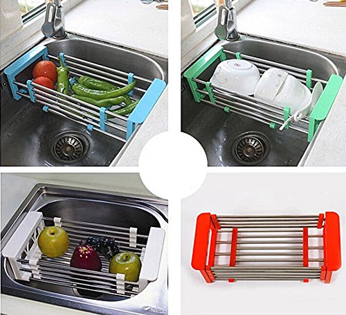 -. Feature : Fits easily into most sinks / Over the sink dish drainer to free up counter space / Material: Plastic & Stainless-Steel / Folding size:35*15.5*9cm / Open size:49*15.5*9cm