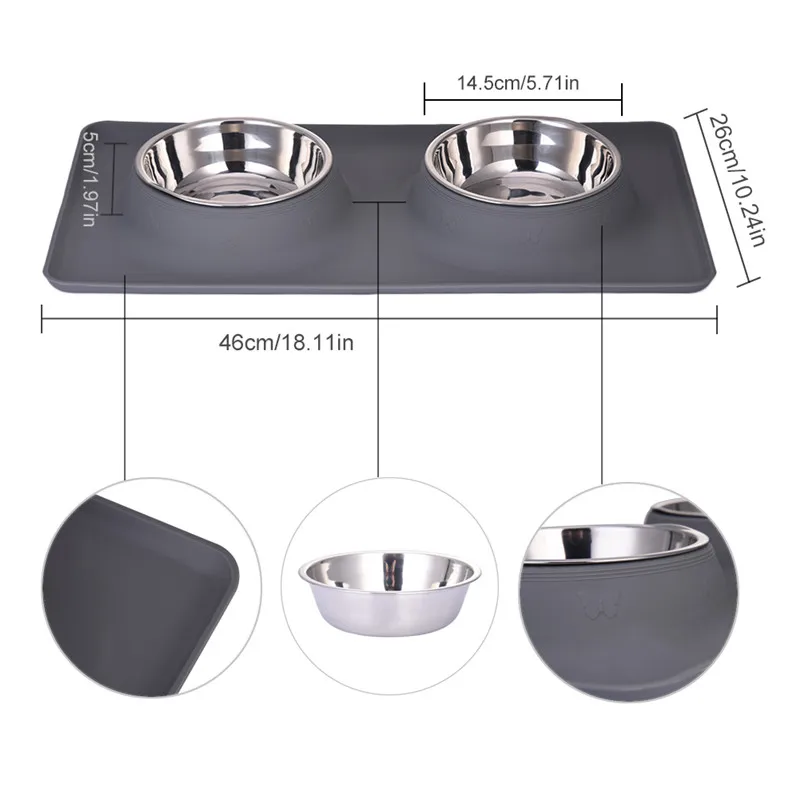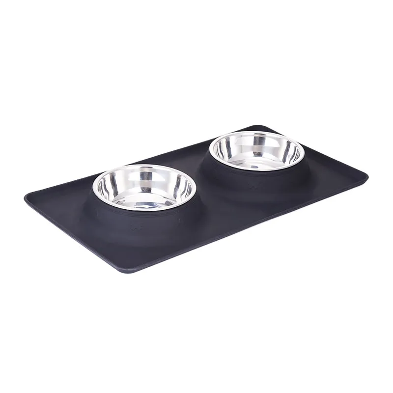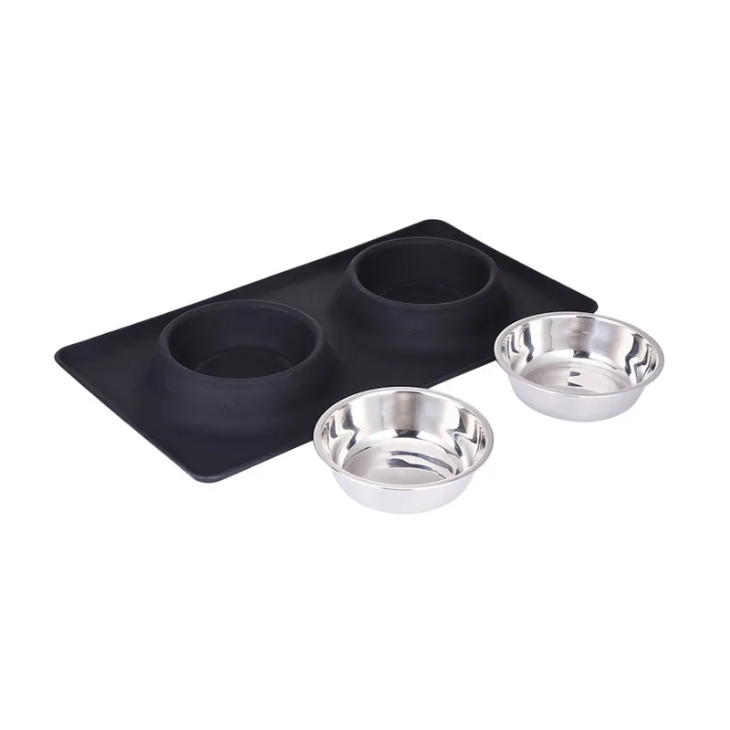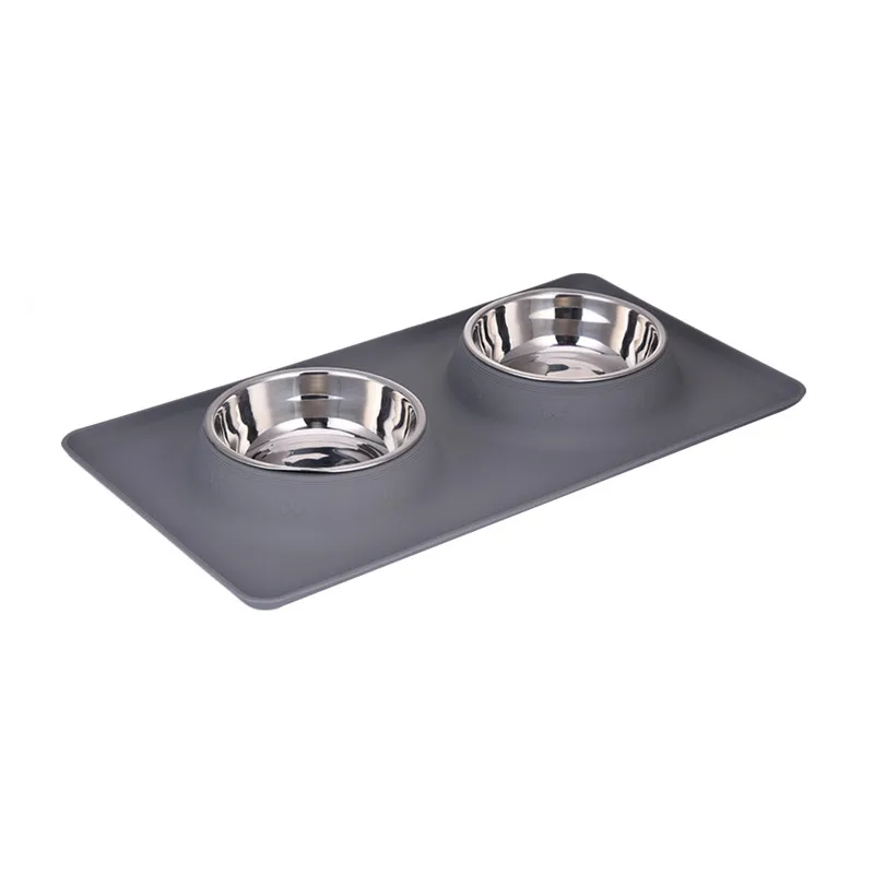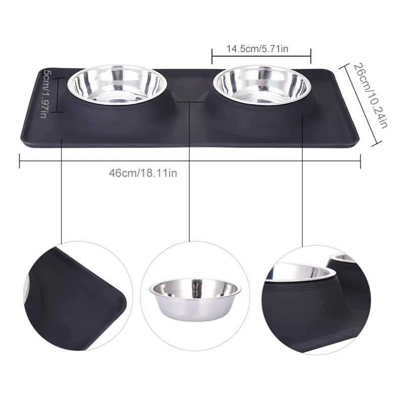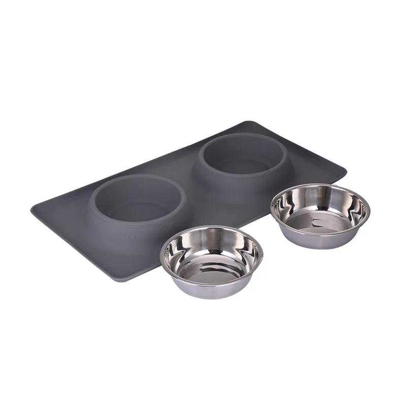 Dog Double Bowl Stainless Steel Travel Feeding Feeder Water Bowl For Pet Dog Cat Puppy Food Bowl Water Dish With With No Spill Non-Skid Silicone Mat