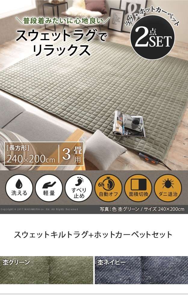 ●ホットカーペット キルトラグ スウェット ヴィンテージ ブルックリン 西海岸 カバー ラグ 洗える 防ダニ 電気カーペット あったか セット 保温シート