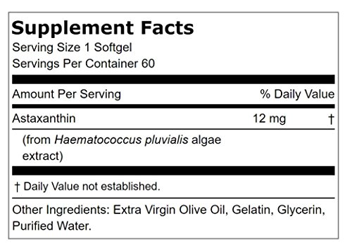 Astaxanthin 12mg contains naturally sourced, non-genetically engineered astaxanthin (AstaReal®). This red carotenoid from microalgae is what gives salmon, krill and lobster their pink-red color. Clinical studies show astaxanthin may support eye, brain, and joint health, skin health during exposure to sunlight and may promote recovery after exercise.Feature