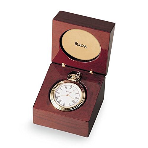 Ashton Table Clock in solid wood hinged case with high gloss piano finish over mahogany stain. Includes pocket watch with engravable back.
