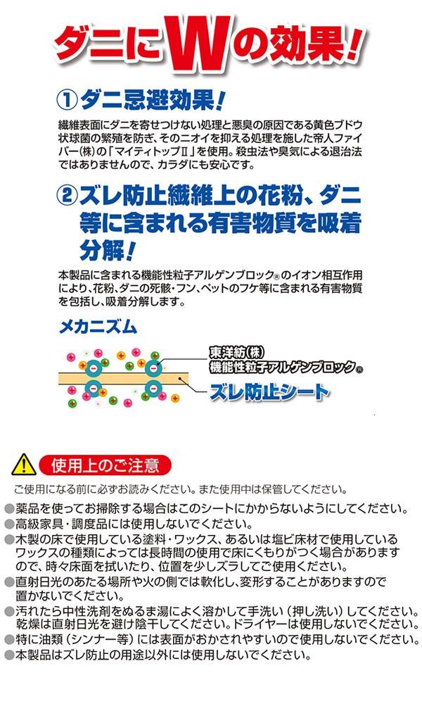 | 素材・材質 | 芯材:ポリエステル100%(抗菌綿マイティトップII使用) ズレ防止樹脂:アクリル系 花粉・ダニ対策薬剤:アクリル系高分子 |