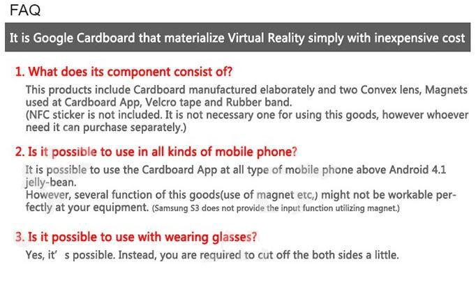 The DIY Google Cardboard VR mobile phone 3D glasses headset, instantaneously transforms your Smartphone into a VR headset. Android OS: search "Cardboard" in Google Play (needs Android 4.1+). IOS OS:search "Cardboard" in App Store. Type: Unassembled DIY Cardboard Kit, 1~2 minutes assembly. Material:Cardboard + Resin Lens. Compatibility:iPhone, Samsung Phones, Google Nexus 4/ 5/ 6, HTC One, Xiaomi Mi3 and other brand phones with 4-5 inch screen. Color:Box color, as shown in the picture.