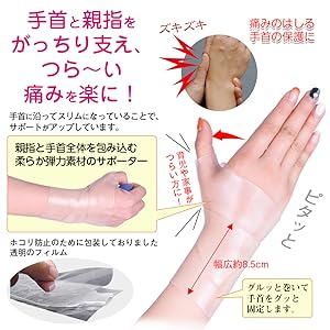 親指と手首全体を包み込む柔らか弾力素材のサポーター。