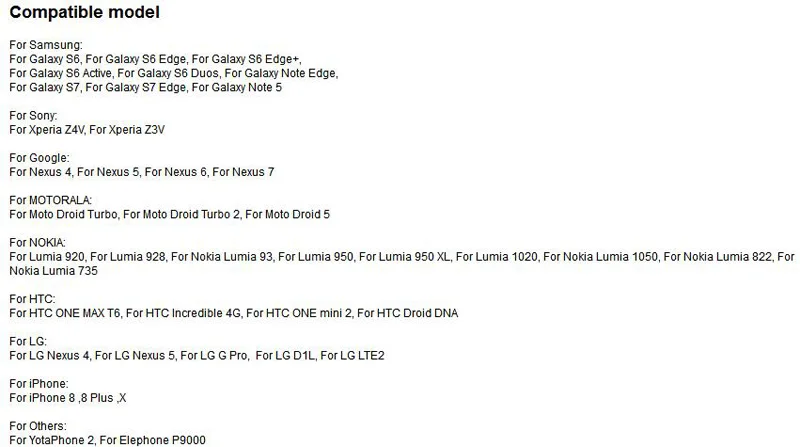 Samsung S6/ S6 Edge / S6 Edge Plus / S7 / S7 Edge/ iPhone 8 / iPhone 8 Plus / iPhone X /Nokia Lumia 820 / 920 / 1020 / 1520 / 822 / 93 / LG Nexus 4/5/6 / LTE2 / D1 / HTC 8X / Huwawei W3 . etc.u0026nbsp;