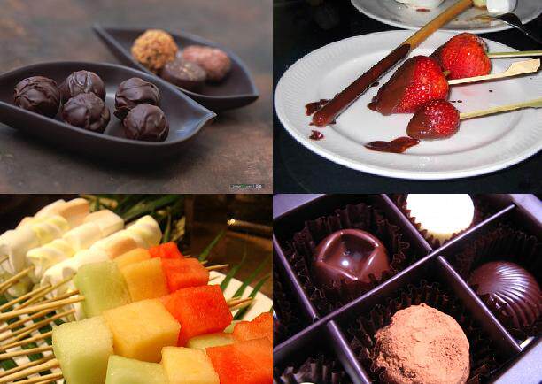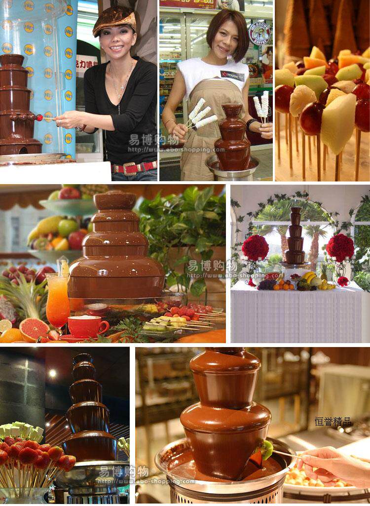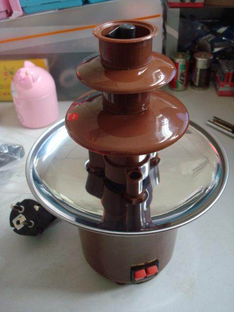 【功能】加热的底盆使巧克力一直保持在融化状态。液状的巧克力进入喷泉机中央的缸体,进而被旋转的螺旋转运输到喷泉机顶部,再从顶部流回底部。流经的梯状圆锥体制造了巧克力瀑布的效果,通常可用部份类型的水果、棉花糖等蘸取巧克力,让巧古力凝结在水果、棉花糖上面,然后食用。