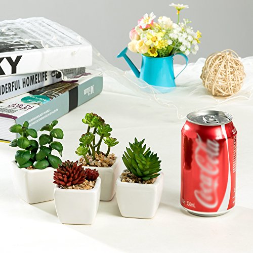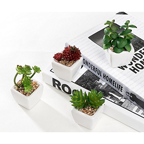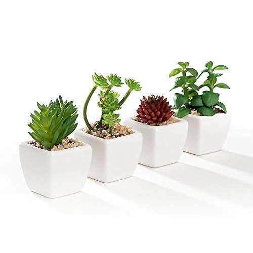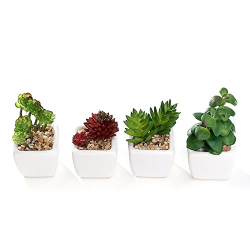Nattol Set of 4 Different Mini Artificial Succulent Plants Potted in Cube-Shape White Ceramic Pots for Home Decor (White)