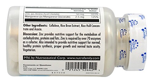 Suggested Use As a dietary supplement Use as directed. Take 1 tablet daily with a meal or glass of water. Store in a cool,dry place. - Or as directed by your healthcare professional. Supplement FactsServing Size: 1 tabletAmount Per Serving% Daily Value***Zinc (as Amino Acid Chelated)50 mg333%Manganese (as Manganese Gluconate)2.5 mg125% ***Percent Daily Values are based on a 2,000 calorie diet