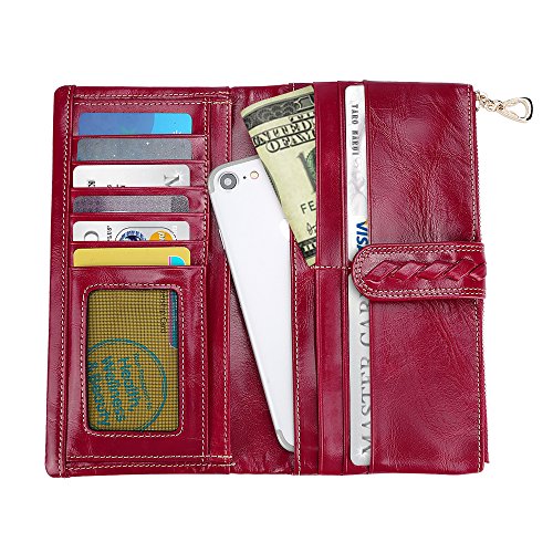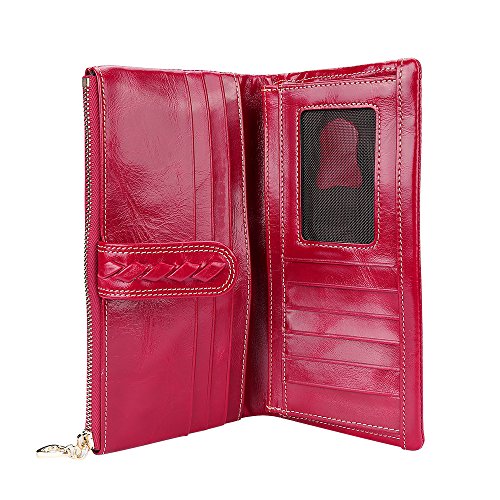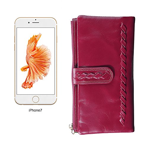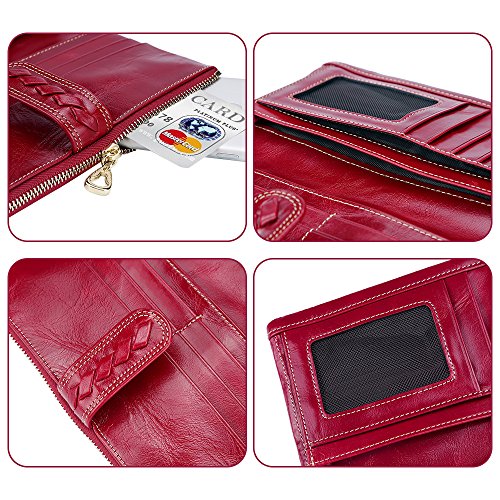 -. Feature : Vintage Design: The lady leather wallet features in handmade woven pattern, polished leather, and classic colors. It's a perfect women purse for daily use. / Inner Structure: This beautiful wallet has large capacity, which has 11 card slots, 1 photo slot, 2 slots for tickets and paper money, and a zipped slot for cash and phone, making your stuff organized and secure. / Durable Material: This women purse is made of high quality cowhide leather and the zipper is easy to open and close. / Ideal Gift: This stylish purse is wrapped in a box, it's the best present to your lover, friends and family. / Beautiful Color: The perfect red color can makes you be more elegant, and it also can meet your different needs of costume.