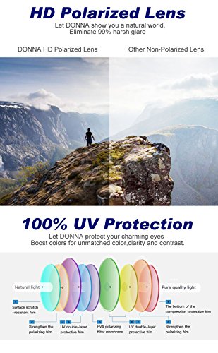2.Why Donna is your choice? 1)UV Protection Donna sunglasses will protect your eyes and block that eyeball-searing ultraviolet (UV) light.The sun gives off UV radiation that you can't see or feel. In small doses, it boosts vitamin D. But too much of it can damage your sensitive eyes. 2)Polarized Lens Anti glare on water,pavement,and other reflective surfaces by filtering light coming from different angles. These special lenses make colors and objects appear clearer, so you can see every detail of the open road, golf course, or mountain trail ahead.. 3)Forward-thinking Appearence Designs Wrap around frames offer wide coverage,Refined rectangular frame complements a range of facial shapes. 3.What will you get? 1 x Sunglasses 1 x Glasses Bag 1 x Cleaning soft cloth 1 xGlasses Screwdriver 1 x Manual instuction 0