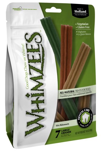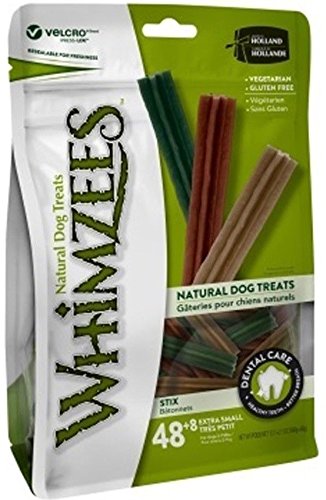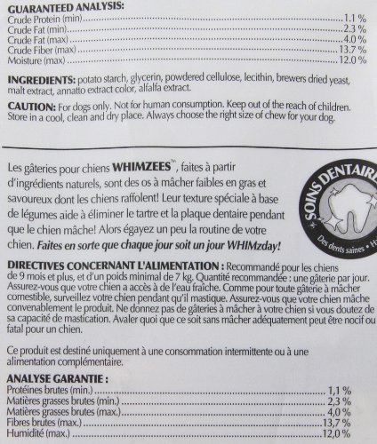 Whimzees are flavorful dental dog treats in toothbrush shapes your dog will love. Totally edible, they are made of natural vegetables with no added chemicals, wheat, gluten or meat byproducts. Nice and chewy, they also help freshen breath and reduce plaque build-up on the dog's teeth. Dental health is as important for dogs as it is for humans, Whimzees dog treats make it easy.Feature