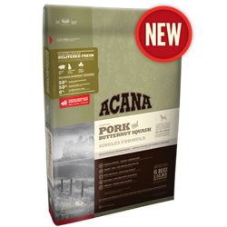 Acana Pork and Butternut Squash Dry Dog Food is sure to please even the most finicky of eaters. This Whole Prey Diet contains pork meat and organs as its only animal protein sources. This supplies your dog with as much natural nutrients as possible and limits the need for synthetic vitamins and minerals. It is made from only the best locally sourced ingredients, never outsourced. Try it TODAY!