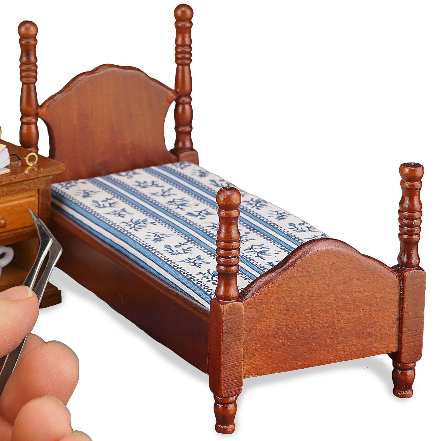 これはミニチュアです。 購入前にサイズをご確認ください。 【注意!必ずお読みください】ロイターポーセリン商品は手作り部分が多いため、細部が写真と異なる場合がございます(例:色、柄、形状、素材、配置等)。気になるお客様は事前にお問い合わせください。 ドイツロイター社製の子供用ベッドのミニチュアです。木製です。こちらはマットレスと同柄の掛布団と、まくらになる部分が付属しています。掛け布団と言っても、まあ簡単なものですが…。ハイジオットの少女ドールにサイズがピッタリで、ちょっとワクワクしました!珍しい家具ですので、ドールハウスの子供部屋や屋根裏部屋にいかがでしょうか?写真では茶色ですが、実物はもっと渋い、マホガニーに近いお色です。ベッドのサイズ:W70xD146xH95mm。スケールは1/12です。下写真はナイトテーブルと合わせて置いたところです。※ナイトテーブルは別売りになります。
