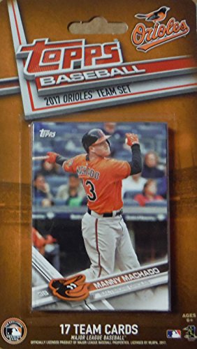 [Product Information]- This is a 2017 Topps Baltimore Orioles factory sealed special edition 17 card team set; cards are numbered BAL-1 through BAL-17 and are not available in packs. Players included are Manny Machado, J.J. Hardy, Caleb Joseph, Chris Davis, Brad Brach, Jonathan Schoop, Hyun-Soo Kim, Zach Britton, Adam Jones, Chris Tillman, Kevin Gausman, Darren O'Day, Oriole Park Card, Mychal Givens, Welington Castillo, Dylan Bundy and Joey Rickard.