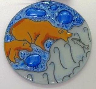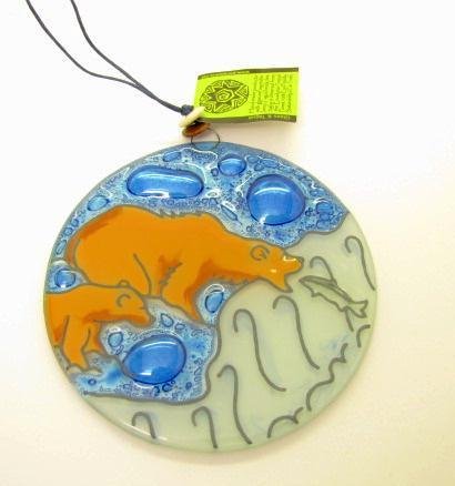 Quality Fused Glass Suncatcher 5" Brown Bears in River Catching Salmon