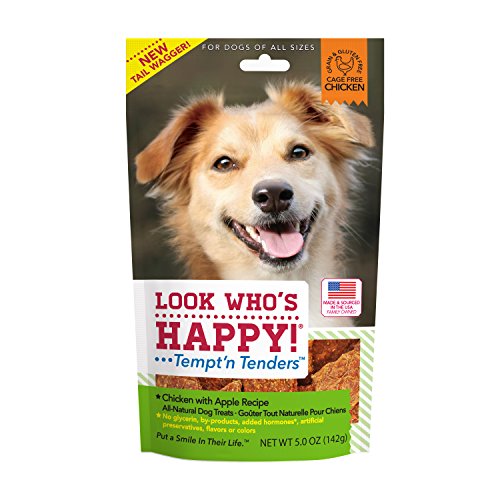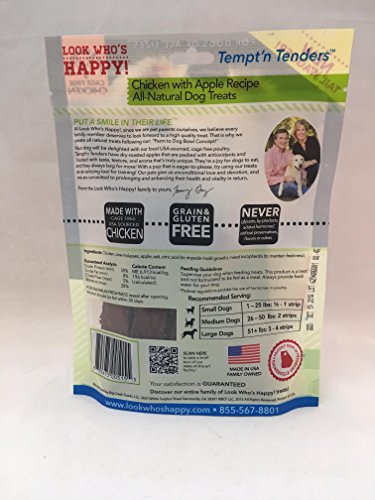 -. Binding : Misc. -. Brand : Look Who's Happy Dog Treats -. EAN : 0855475005155 -. Feature : Made with USA-raised Cage free chicken / Tempt 'n Tenders natural treats are crusted with yummy goodies / Loaded with taste texture and aroma that's truly unique they're a joy for dogs to eat -. Label : Big Creek Foods makers of Look Who's Happy Dog Treats -. Manufacturer : Big Creek Foods makers of Look Who's Happy Dog Treats -. Model : F20004 -. MPN : F20004 -. NumberOfItems : 1 -. PackageQuantity : 1 -. PartNumber : F20004 -. ProductGroup : Pet Products -. ProductTypeName : PET_SUPPLIES -. Publisher : Big Creek Foods makers of Look Who's Happy Dog Treats -. Size : One Size -. Studio : Big Creek Foods makers of Look Who's Happy Dog Treats -. Title : Look Who's Happy Dog Treats 5 oz 1 Pouch Chicken and Apple Treat, One Size -. UPC : 855475005155