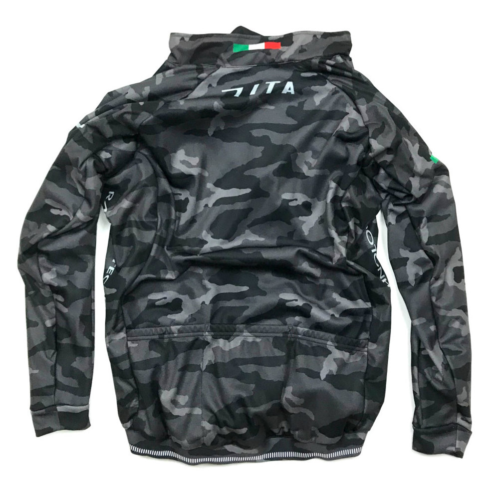 前面がウィンドプルーフ、背中部分は裏フリースのジャージ素材を使用した、ジャケットとジャージの中間に位置する防風保温ギア。