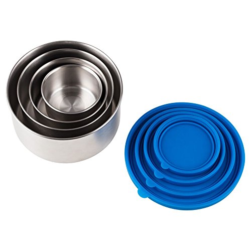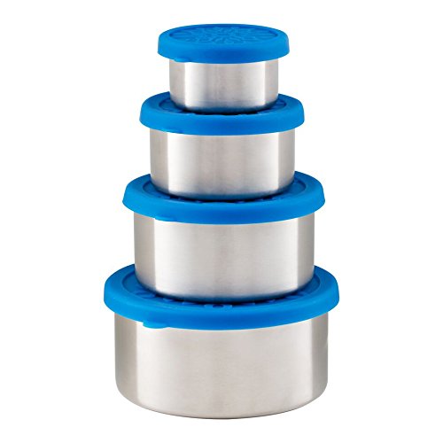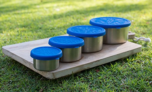 - YOUR SET INCLUDES - 4 round stainless steel containers with leak-proof silicone lids. Large container: diameter 12.5cm, height 6cm, capacity 700ml. Medium container: diameter 10.5cm, height 5.3cm, capacity 400ml. Small container: diameter 8.5cm, height 4.4cm, capacity 200ml. Extra small container: diameter 6.7cm, height 3.6cm, capacity 100ml. Your set will also nest inside one another, saving cupboard space.