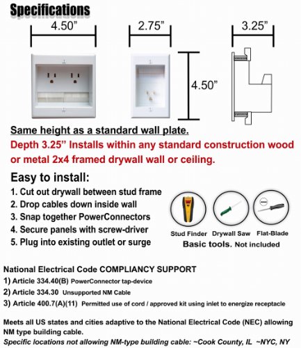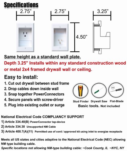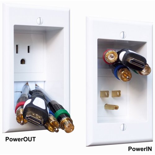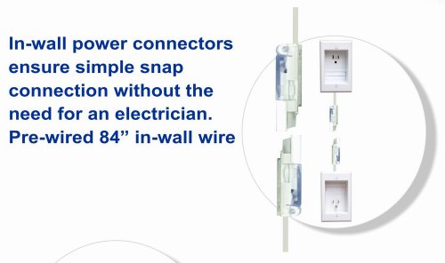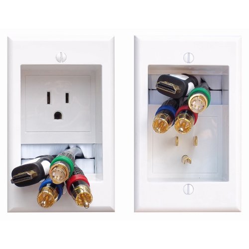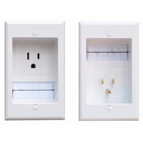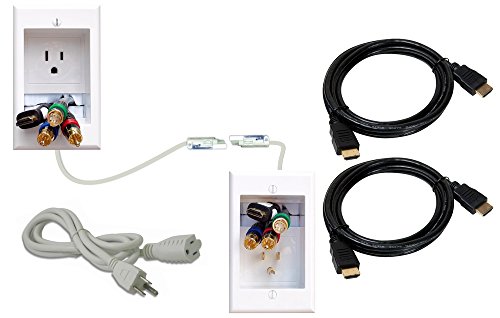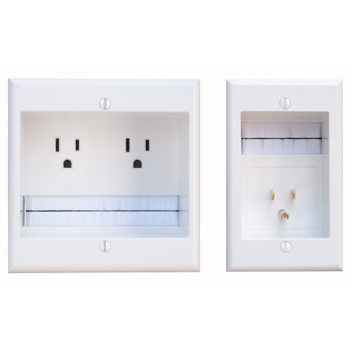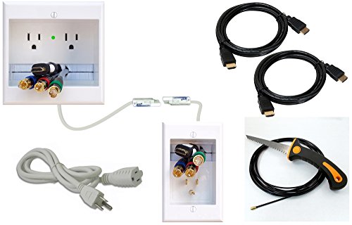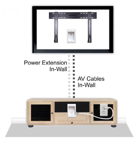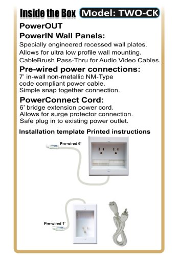 [Description] Dual Outlet In-Wall Cable Management System for Wall Mounted Flat Screen LED_ LCD_ and Plasma Televisions. This kit includes Two Power Outlets for mounting either two (2) TV``s OR one (1) TV and one (1) Audio Visual Accessory Such as a Soundbar. No more messy cables hanging down the wall between the TV and the floor. No electrician needed with snap together Power Connectors. This system allows for Wall Mounted TV``s to hide low-voltage cables and wires routed behind the wall for a clean look. The Included In-Wall PowerConnect Cable and 6-foot Power Cord is code compliant. Does not include HDMI Cables or other Low Voltage Audio Visual Cables. Included Recessed wall mount plates are hidden behind Flat Screen TV Mount and should work with the thinnest TV mounts and thinnest TV``s on the market. Top Rated Product with Simple Easy DIY Installation.