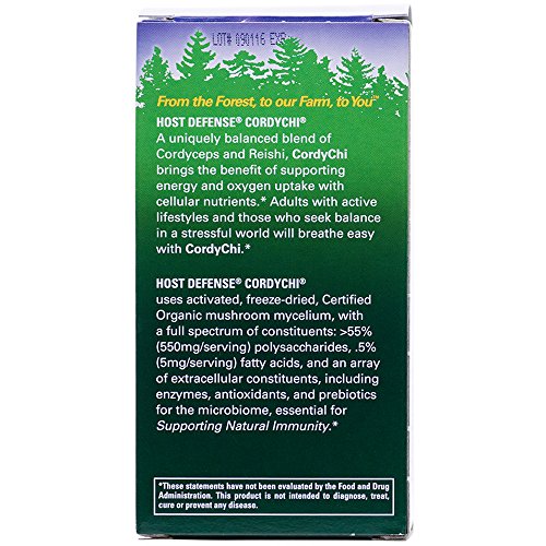 Studio : Host Defense Publisher : Host Defense Binding : Health and Beauty Product Description A uniquely balanced blend of Cordyceps and Reishi, CordyChi brings the benefit of supporting energy and oxygen uptake with cellular nutrients. Adults with active lifestyles and those who seek balance in a stressful world will breathe easy with CordyChi. Host Defense CordyChi uses activated, freeze-dried, Certified Organic mycelium, with a full spectrum of constituents: polysaccharides (beta glucans, arabinoxylane, glucose, xylose, galactose and cordycepic acid), glycoproteins, ergosterols, triterpenoids and other myco-nutrients, which are essential for Supporting Natural Immunity. 0