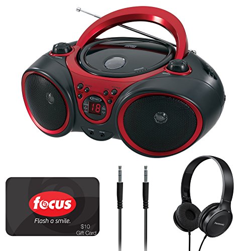 -. Feature : Jensen CD-490 Sport Stereo CD Player with AM/FM Radio and Aux Line-In / Panasonic Lightweight On-Ear Headphones (Black) / Focus Camera $10 Gift Card for Online and In-Store Purchases