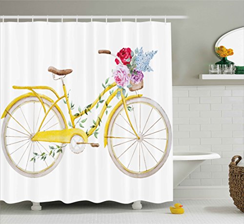Vintage Shower Curtain by Ambesonne, Watercolor Style Effect Bicycle with Leaves and Flowers in the Basket Pattern, Fabric Bathroom Decor Set with Hooks, 84 Inches Extra Long, White and Yellow
