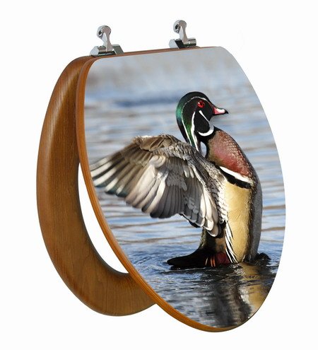 -. Brand : Topseat -. Color : Brown -. EAN : 0848726000351 -. Feature : Top of the seat has a life like 3D image of a Wood Duck flapping its wings / The rest of the seat is a beautiful, hand sanded, smooth oak wood finish / Wood composition offers smooth comfort, warmth and durability / Sturdy and stylish chromed metal hinges / Fits elongated toilet bowls - See diagram -. Label : TOPSEAT -. Manufacturer : TOPSEAT -. Model : 13DCPMDK -. MPN : 13DCPMDK -. NumberOfItems : 1 -. PackageQuantity : 1 -. PartNumber : 13DCPMDK -. ProductGroup : Home Improvement -. ProductTypeName : PLUMBING_FIXTURE -. Publisher : TOPSEAT -. Size : Elongated -. Studio : TOPSEAT -. Title : TOPSEAT 3D Upland Series Elongated Toilet Seat w/ Chromed Metal Hinges, Wood Duck -. UPC : 848726000351