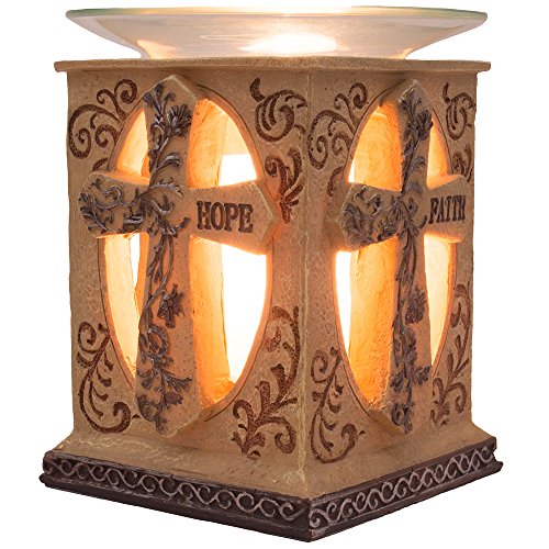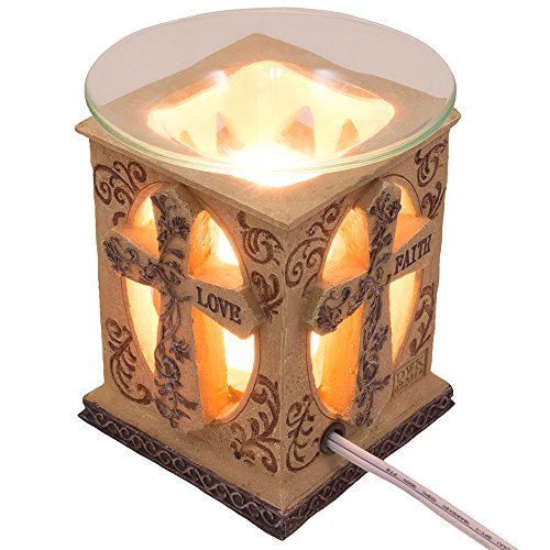 Elaborately carved with the image of the holy cross, this inspirational electric oil warmer invokes a mood of spiritual reflection. Faux stone cross is emblazoned with words of love, hope and faith; at the center, a precious golden light shines. Add your favorite scented oil to the clear glass dish, set the amount of heat and light using the dimmer switch, and surround your spirit with a halo of divine fragrance! Makes the perfect Lent and Easter decoration for homes with Christian décor. A great inspirational gift idea for anyone with strong religious faith. Includes one clear glass dish, a glass light cover, and one Halogen 35 watt 110v oil warmer bulb. UL approved cord with adjustable dimmer switch.