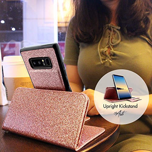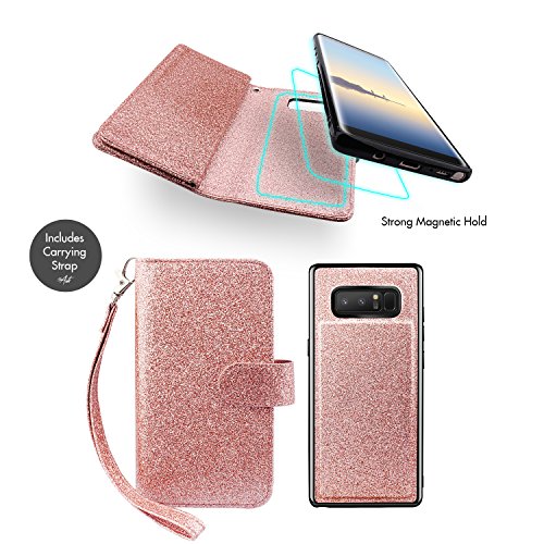 -. Feature : Galaxy Note 8 case: COMPATIBILITY - For iPhone 7 & iPhone 7s - Brilliant full coverage of glitter shine material and all made from quality tested synthetic leather with soft TPU. / Case for Galaxy Note 8 : KICKSTAND - Usable as a kickstand both uP.R.Ight for facetime or sideways for movie or video viewing. / Galaxy Note 8 wallet case: WALLET FEATURES - A replacement for your wallet! Includes 8 credit/bank card slots, 1 photo/ID slot, 2 cash slots, a snap fastener for secure closing, and a magnetic case close clip. / Cases Galaxy Note 8 : 2-IN-1 DESIGN - Hybrid Flip wallet case style with easily removable inner case held by powerful magnets. Super useable convertible design and perfect functionality for all situations. / Galaxy Note 8 Cases : INCLUDES FREE - Universal magnetic car mount and easy carry detachable hook wrist strap. All included in our beautiful custom designed gift box.